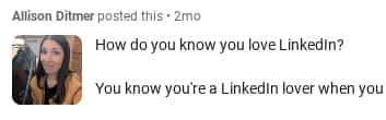 And I have to wonder if, because I mentioned the word "love" and "LinkedIn" in the first 7 words, that may have made a difference when getting it picked up and throttled to be in front of more people organically? Hmmmmm.....